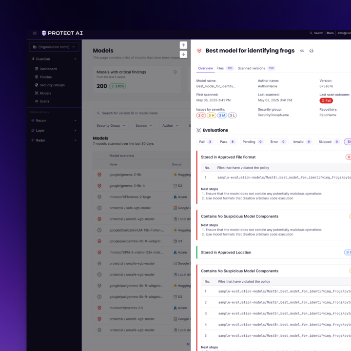 - Scan models across formats (TensorFlow, PyTorch, ONNX, LLM formats) and surface risks clearly